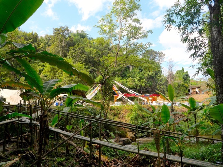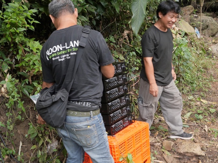 Amnesia Anthills This installation compiles sound recordings from The Fields; sounds from distant and disparate locations such as lakes, trees, grounds, sky, villages, construction, and animals are drawn into a host structure. Inside, visitors experience a symphonic combination of the sounds and investigate their sources. Familiar and strange vibrations intermix to create a new language we can observe together. The sound installation combines 12 horn speakers at the forest path of Sai Mok waterfall “The Great Gathering” 2023.