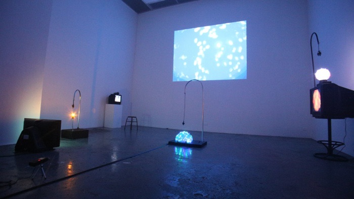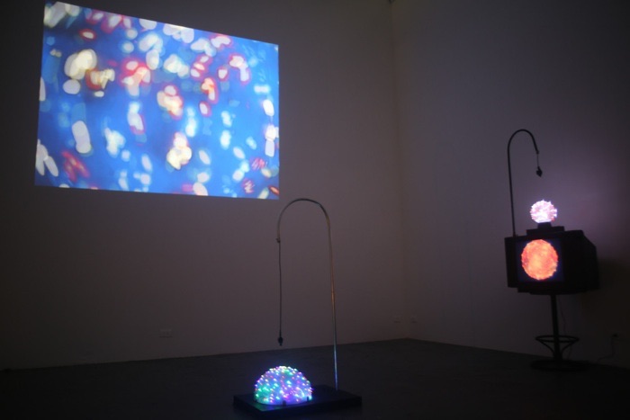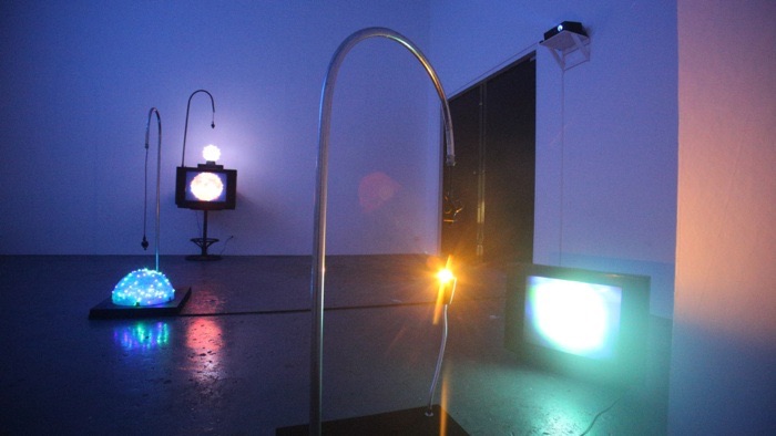 This installation consists of three pieces incorporating sculpture, light, sound, and video. The light sculpture uses rainbow-colored Christmas lights and a modified CCTV camera that occasionally moves with the vibrations of a motor. The video images are projected onto three CRT TVs and one projector, which casts the images onto the large wall of the exhibition room. The visual projection of the shaking lights appears on the wall. The humming sound of the motor vibrations is amplified through a loudspeaker.