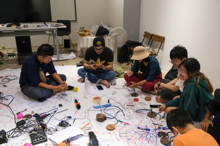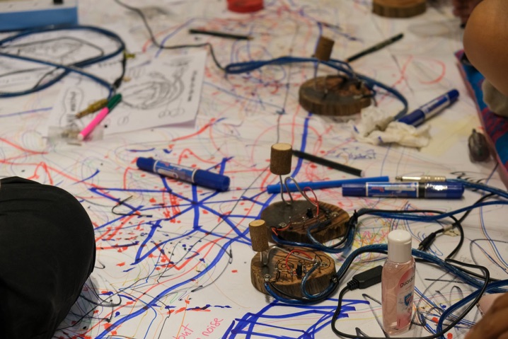 This workshop focused on creating DIY instruments capable of generating simple noise frequencies using only a few electronic components. The design of each instrument depended on the participants, who used local objects (plastic bottles, wood, paper, etc.) to build their creations. The resulting sounds varied, with each simple instrument representing the inner vibrations and personal expressions of its maker.
