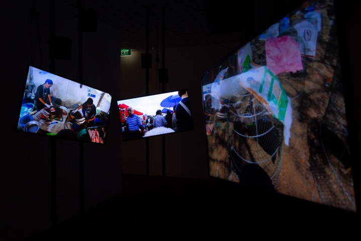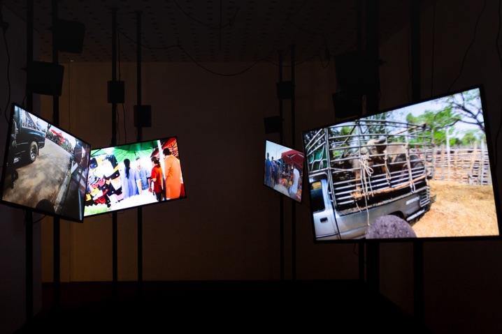 Interested in the notion of sound as a vibration and the world as a network of complex vibrations, Arnont Nongyao creates experimental sound performances and installations. Opera of Kard (Market) is an immersive multi-screen installation. Each of the 12 channels plays back the sounds and scenery from a kard, or local market in northern Thailand. These weekly markets are gathering places where people from different ethnic backgrounds congregate, communicate and trade. From people chattering to birds singing and the wind blowing, each kard is, for the artist, also a musical score. Rearranged into a single composition, the sounds now come together as a socio-cultural operatic performance of the kard.