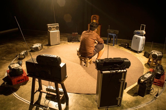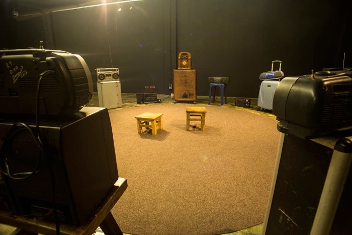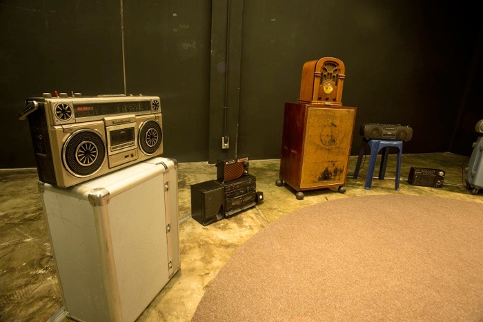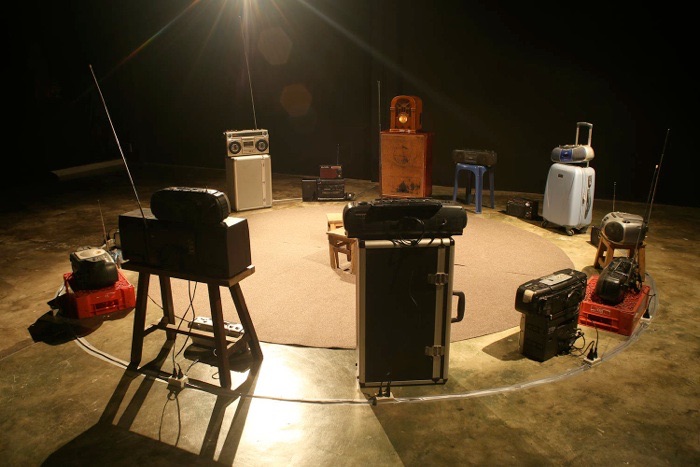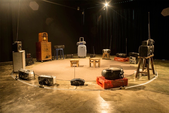 There are a total of 20 radio receivers, including modified radio receivers and a defective radio transmitter. Each radio receiver tunes into different radio channels, and a random sound plays from these channels. The audience will experience a mix of sounds and listen to new sentences when they sit in the central area. The sound will change constantly depending on the radio channels.