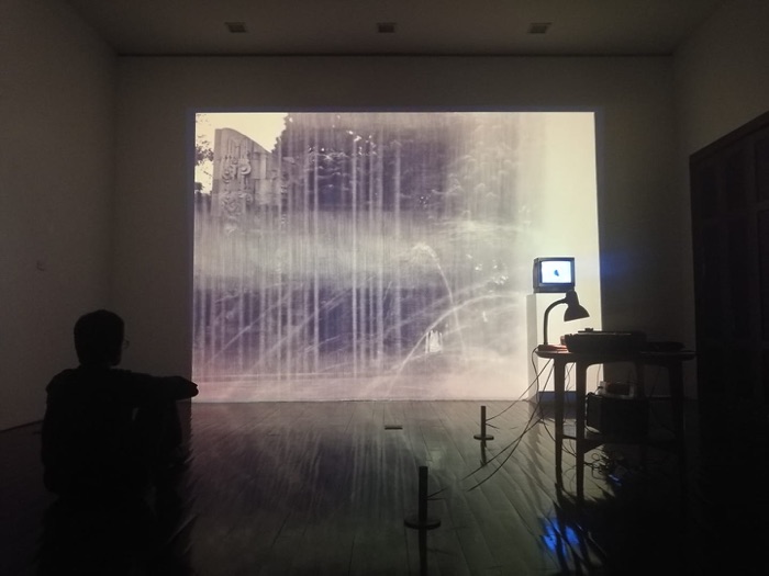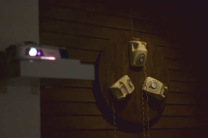 “Sphere” is like a poetic reflection on relationships, reminiscing about the old days when analog tape recorders captured vibrations as magnetic waves on adjustable tape rims. The exhibition includes two sound sculptures, one circular mixed media piece on the wall, two video installations projected on the wall, and a CRT TV. The first video installation projected on the wall features footage of a fountain in front of the sculpture "The 1946 Communist Revolution in Northern Vietnam" at Hang Dau Park in Hanoi, along with a Vietnamese man walking past the fountain. The second video, displayed on a CRT TV placed in front of the first video's screen showing the white waters of the fountain, depicts a dying bee. The audio from both videos is transmitted to the spherical sound sculpture opposite the video installations. This sound sculpture is constructed from three old telephones mounted on a circular wooden plate. The audiences could listen to the video audio—fountain sounds and the dying bee's sounds—through the telephone receivers.
