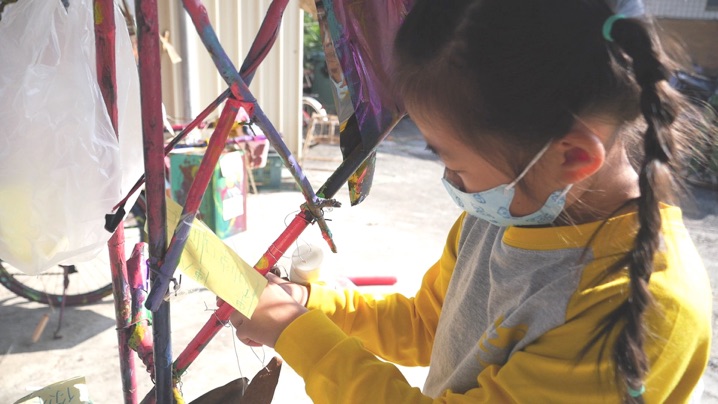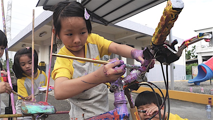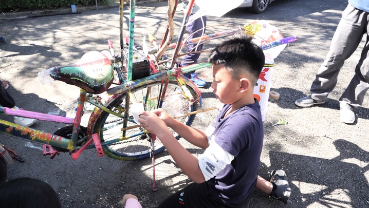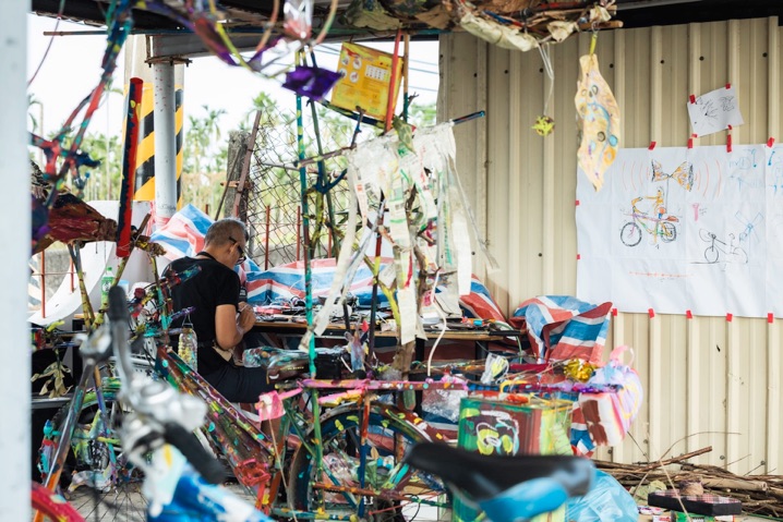 "The bicycles donated by local residents were like empty vinyl records at first. Since Arnont visited Da-Cheng, these objects have gradually turned into this vinyl record, day by day, through the involvement of students and people. The melody and sound reflect what we are naturally playing together. The motion of the bicycle is like the operation of vinyl record players, creating noisy, overlapping vibrations. As we explore the Earth's layers, overlapping layer by layer, when we are riding the bicycle that we can hear how each layer connects, feeling the vibrations of “Playing with Nature (of Mind)” in Dacheng"