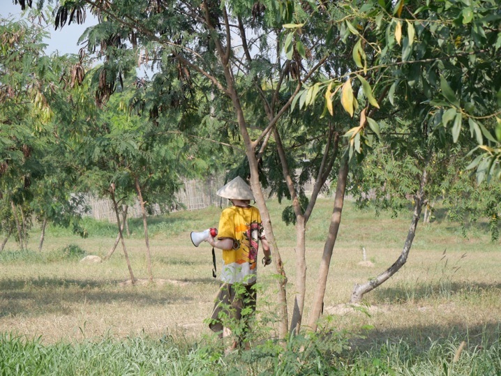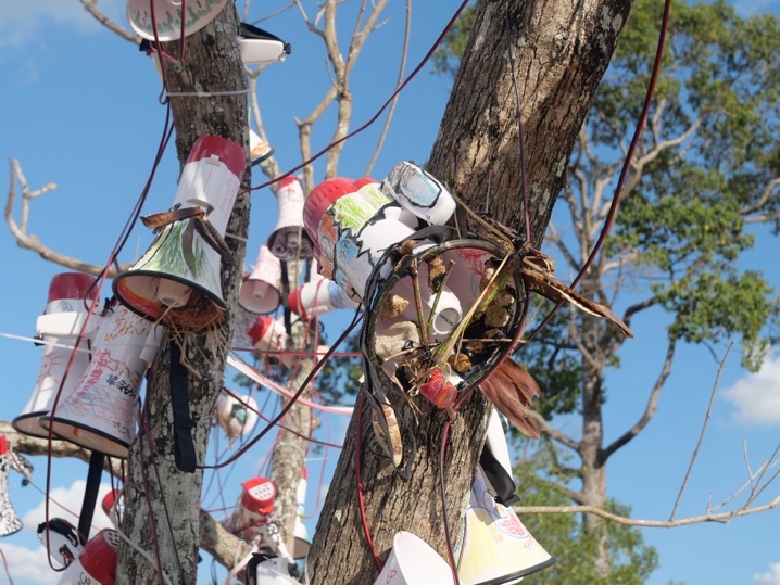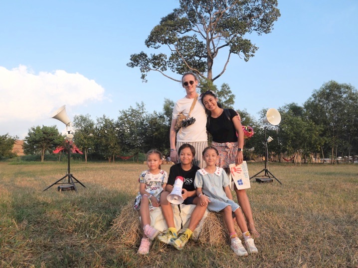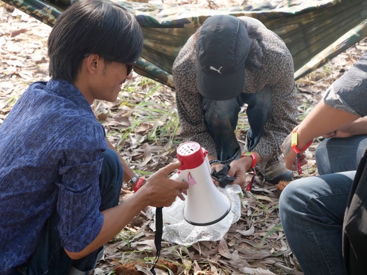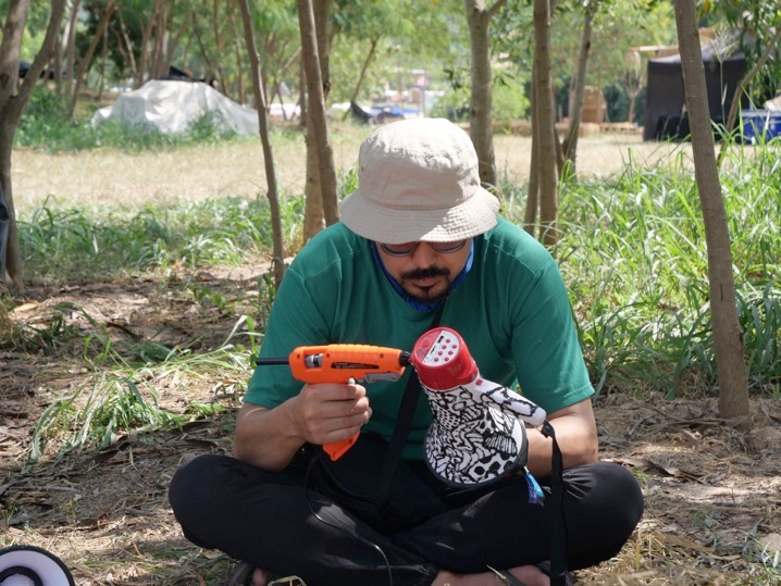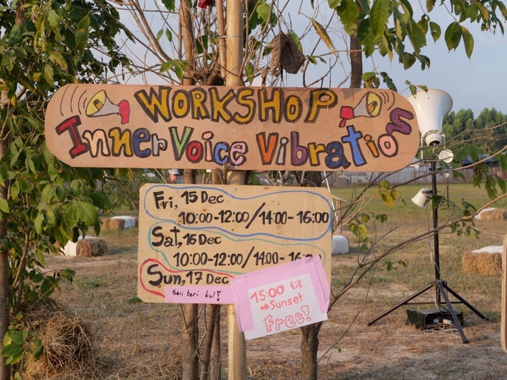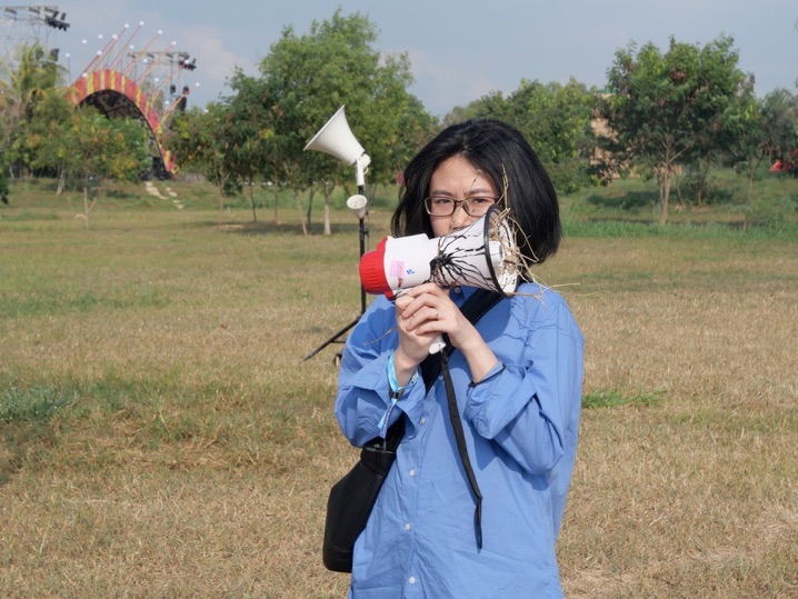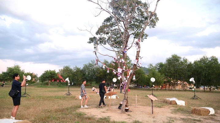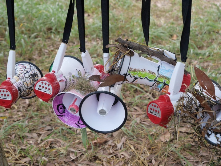 “Inner Voice Vibration” workshop used the megaphone as a tool for recording participants' voices. The concept of using the megaphone is inspired by Ken Ueno, a composer, vocalist, and sound artist (https://kenueno.com/). Participants walked around the WonderFruit site and tried to find areas that attracted their ears, encouraging them to stop and concentrate on listening. After that, they will be asked to re-generate the sounds using their voices, record them into megaphones, and then paint on the megaphones. All the megaphones installed as part of the sound installation "Under the Tree Tango"