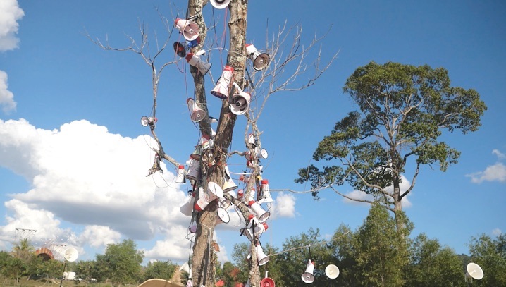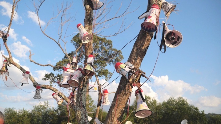 Sound Installation and workshop with 42 megaphones installed on a tree, surrounded by 32 horn speakers, using a 32-channel sound system.
