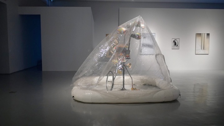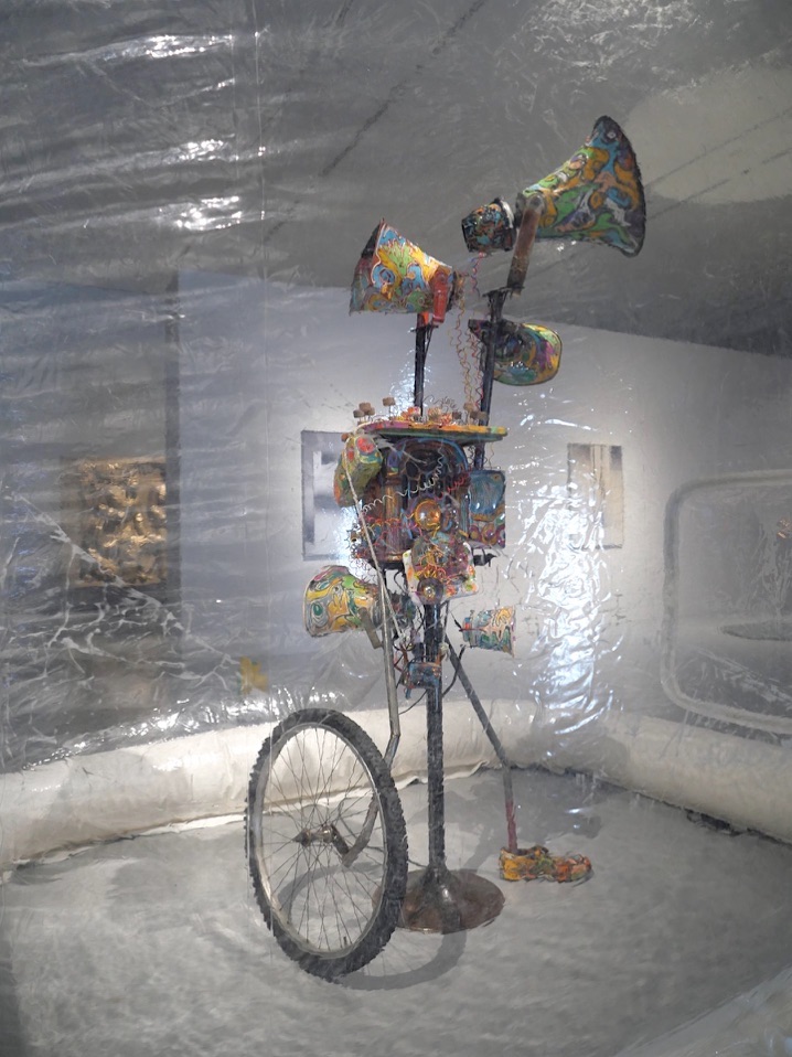 The sound sculpture made from used sound objects, radio receivers, kid toys, etc. Installation in the inflatable transparent tent 300 x 220 x 290 cm. for “Acquisitions office of Contemporary Art and Culture 2023” at National Art Gallery, Ministry of Culture, Bangkok. The collection of Ministry of Culture Thailand 2023.