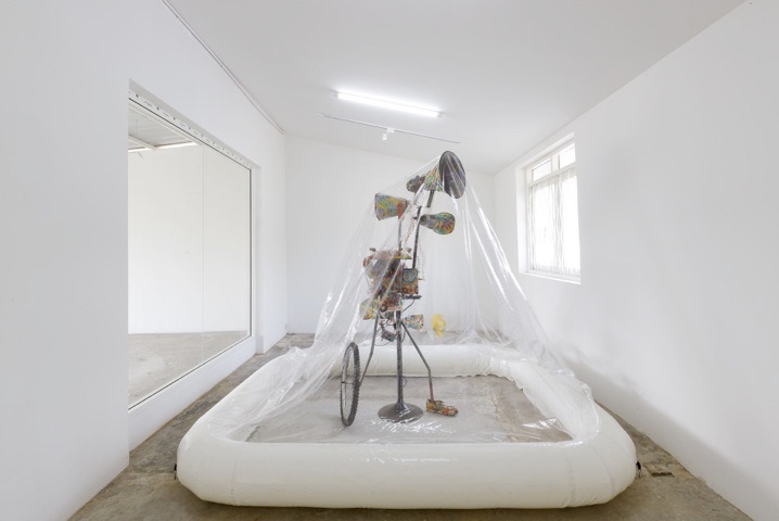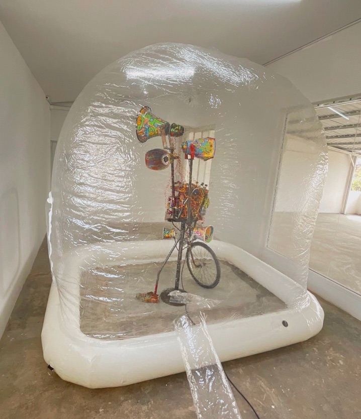 The sound sculpture made from used sound objects, radio receivers, kid toys, etc. Installation in the inflatable transparent tent 300 x 220 x 290 cm. This work is a part group exhibition “Panic World” Air For Air 2 curated by Kamin Lertchaiprasert, at Panic Room, DC collection, Chiangmai, Thailand.